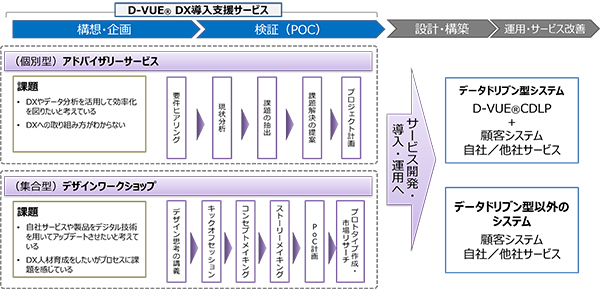 同サービスは、顧客の課題に合わせて「アドバイザリーサービス」と「デザインワークショップ」の2種類のメニューを用意している。アドバイザリーサービスは、顧客の目標、現状、課題を客観的に整理し、解決のためのロードマップを立案する「個別型」サービス。一方、デザインワークショップは、デジタルを活用したサービス設計や、顧客のDX人材育成に向けて、ワークショップや実証実験を行う「集合型」サービスとなっている。