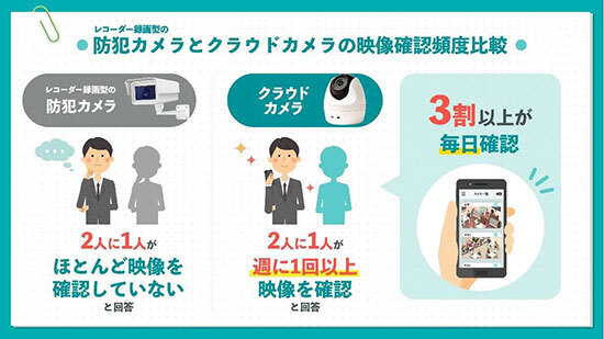 「映像の確認頻度」に関する質問では、レコーダー録画型の防犯カメラを使用している場合、「週に1回以上確認する」人が40%である一方、「ほとんど確認しない」という回答が50%にのぼり、利用者の2人に1人がほとんど映像を確認していない結果となった。このことから、活用されないまま放置されている映像データ“休眠映像”の存在が明らかになった。また、クラウドカメラを使用している場合、「週に1回以上確認する」人が50.6%で、中でも「毎日確認する」と答えた人が30.1%にのぼる結果となった。