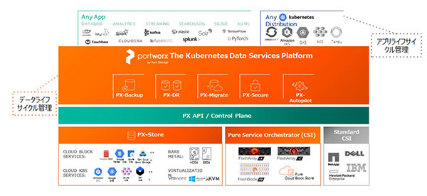 Portworxは、20年9月にピュア・ストレージが買収した米ポートワークスが開発した製品で、Kubernetes上でコンテナとして稼働するSDS(Software Defined Storage)として、オンプレミスの物理ストレージ(HDD/SSD)、外付けディスクアレイから、クラウドのブロックストレージまで幅広く対応する。