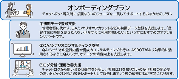 オンボーディングプランは、AIアシスタントチャットボットの導入を検討中の企業を対象として早期に効果を実感できるサービス。チャットボット導入時に必要な「初期データ登録支援」「QA/シナリオコンサルティング支援」「ログ分析・運用改善支援」と三つのフェーズを一貫してサポートする。また、各支援プランは個別に申し込むこともできる。