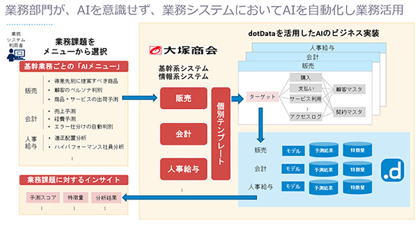 こうした支援を通じ、クライアント企業から「AIを意識せず、高度な技術知識やスキルをもたなくても、AIが導き出してくれるインサイトを業務にシームレスに利用できるサービスを提供してほしい」という要望が寄せられるようになった。その要望に応えるためには、dotDataが提供するAI自動化の機能を大塚商会が提供する各種ITサービスやソリューションに組み込み、クライアント企業のユーザーが本来の業務に注力しながら、ITソリューションの利用の中で自然にAIの価値を享受できる仕組みを提供するのが理想という。