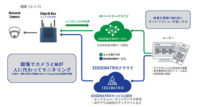 第一弾として、EDGEMATRIXの映像エッジAIアプリケーションの中で特にニーズの高いものを、IPカメラ、エッジAIデバイス「Edge AI Box」とセットにして、「遠隔監視」「施設防犯」「混雑案内」を三つのソリューションパッケージとして、全国のパートナー各社を通じて4月20日に販売を開始した。また、ネットワールドは映像エッジAIソリューション導入のコンサルティングから、IPカメラやEdge AI Boxの設置工事、技術サポートまでをワンストップで提供する。