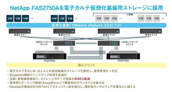 昨年11月から本番稼働を開始した新仮想化基盤では、電子カルテをはじめ検査、看護管理、栄養管理、勤怠管理、DWHなど、ほとんどのシステムを集約できたため、運用管理も一元的に行えるようになった。FAS2750Aによるストレージでは、万一本番系に障害が発生した際にも、待機系のNetApp FAS2750Aを用いて迅速にシステムを復旧でき、従来の最大の懸念が解消された。