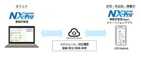 「ACELINK NX-Pro 事務所管理」は、会計事務所所員のタスクやスケジュール管理を行うシステム。他の所員への伝言メモ機能や事務所での研修やイベント情報を共有する掲示板機能などを備えている。今回は、スケジュール管理と対応履歴の機能で、スマートフォンからの入力・閲覧に対応する。
