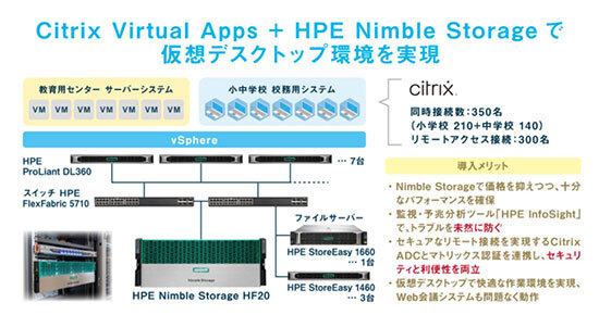 新しい統合基盤では、多くのサーバーやクライアントが稼働することから、ストレージは高いパフォーマンスを確保でき、コストパフォーマンスの高いNimble Storageハイブリッドフラッシュアレイを採用。サーバーもHPE製品を使用していたため、保守を一本化することもできた。また、Virtual Appsへのセキュアなリモート接続を実現するCitrix ADCとマトリックス認証を連携させることで、セキュリティと利便性の両立も実現している。