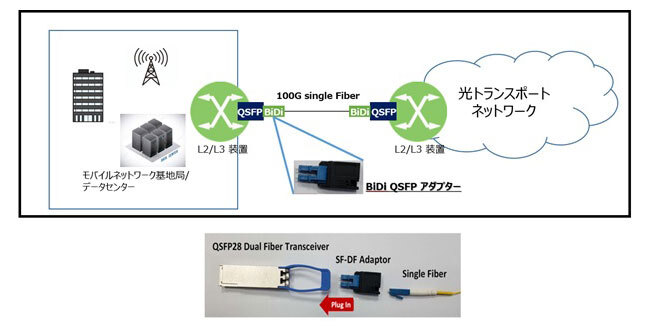 BiDi QSFPアダプターは、LCコネクターをもつトランシーバーに接続することで、2芯(デュアル)の光ファイバーケーブルを1芯(シングル)にすることができるアダプター。2芯から1芯への双方向光ファイバー接続をWDM方式とは違い「同一周波数」で実現する。小型アダプターサイズであることに加え、設定や電源供給が不要であることから簡単に導入できる。また、40G、100G、200G、400Gbpsの速度に適応しており、QSFP28、QSFP-DD、QSFP+、CFP-2のQSFP仕様に準拠している。