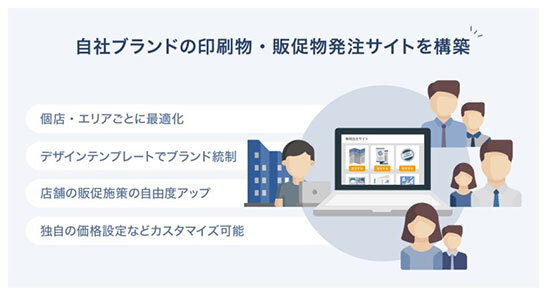 カタログサイト サービスは、自社開発のオリジナルサイトのようなデザインで、統括部門を軸に、複数拠点、店舗、グループ会社、フランチャイズ契約先、協力会社など、利用者の所属が異なっていても、印刷物・販促物の発注内容を一元管理できるサービス。印刷物・販促物の発注は、利用者ごとに権限の異なるアカウントを発行できるため、情報セキュリティ上でも安心できるよう開発している。また、各アカウント別に販促物の販売金額を自由に個別設定できるため、統括部門で販売手数料を得ることができる。