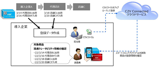 新機能では、流通経路上のトレーサビリティ情報(入出荷情報など)をC2V Connectedで履歴管理することができる。流通トレーサビリティ情報の登録データ(CSVファイル)をアップロードして一括登録する機能を有しており、各導入企業の運用オペレーションに合わせて、専用の登録ツール(別途開発必要)も提案可能。また、登録される流通トレーサビリティ情報を正規品の判定結果とともに表示することもできる。導入企業側から、代理店などの管理したい拠点に対して入出荷情報の提供依頼を行うことで同機能を利用することができる。