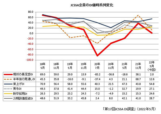 DIについては、「現状の景況感DI」は2.0と辛うじてプラス圏を維持したが、前回調査比では-36.1と大幅に後退した。「半年後の景況感見通しDI」は前回比-56.1の12.6と景況感の回復に急ブレーキがかかった。「次期設備投資DI」についても前回比-12.3の28.7と同様の傾向を示した。一方、「賃上げDI」は、前回比+11.0の54.8で、コロナ禍に入ってからの過去5回で最も高いDI値を記録。「賞与DI」も前回比+7.2の27.1を記録。過去5回では昨年5月に次ぐ高いDI値だった。採用関連DIも高く、新卒採用DIが24.6だったほか、中途採用DIも50.8と、いずれもコロナ禍以降の過去5回では最高の値になった。