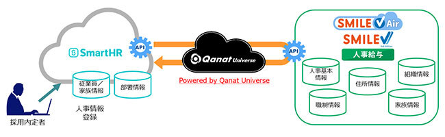 今回リリースするSMILE V APIコネクト for SmartHRは、JBアドバンスト・テクノロジーのAPI連携サービス「Qanat Universe API-Connect」を利用し、SmartHRとSMILE V2 人事給与間で従業員情報の連携を実現する。入社手続き時には、採用内定者本人がSmartHRに入力した従業員情報を、SMILE V2 人事給与に簡単に取り込める。