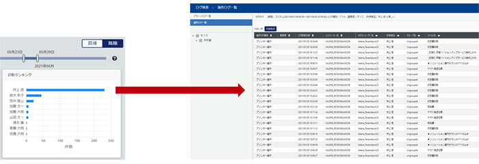 PC台数に関わらず、最大7年間分をクラウドに収集した状態で保管でき、その全てのログを対象に検索することを可能。分析期間をスライダーを動的に移動させることで操作ログをグラフィックにレポートすることができ、異常値を可視化することを実現した。