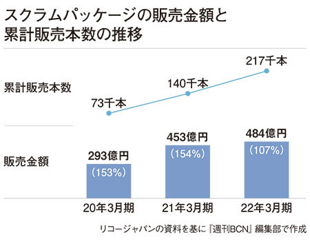 スクラムパッケージは建設業や製造業、流通業など9業種を主な販売ターゲットと位置付け、これに情報セキュリティやリモートワークなどの働き方改革、共通バックオフィス業務の共通業務のパッケージを加えた計154パックを揃える。顧客需要を見極めながら随時改良や入れ替え、追加を実施しており、21年度までに累計21万7000本を販売。リコージャパンは「従来の複合機の販売を中心とした事業形態からデジタルサービス会社に転換する」(木村和広社長)方針を示しており、スクラムパッケージの販売増はデジタルサービス事業への転換を象徴するビジネスに育っている。