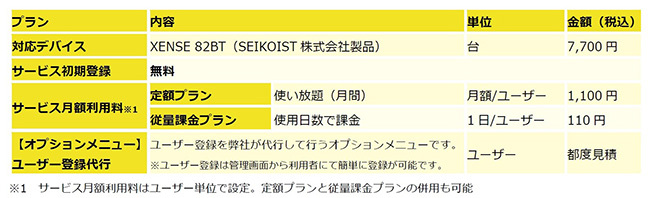 利用料金は、対応デバイス「XENSE 82BT」(SEIKOIST製品)が7700円/台、サービス初期登録が無料、定額プラン(使い放題)が月額1100円/ユーザー、従量課金プランが1日110円/ユーザー。