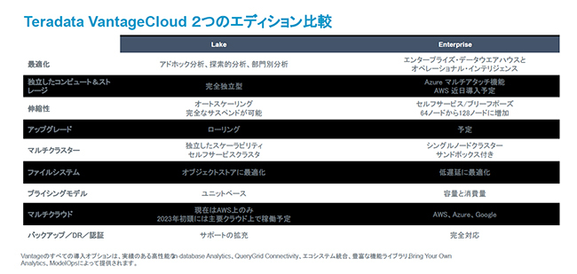 Enterprise EditionとLake Editionの違いは得意とする領域にある。前者がデータウェアハウスやオペレーション・インテリジェンスといったエンタープライズ・ワークロードに最適化されているのに対して、後者はIT部門の関与を必要としないセルフサービス機能を備え、アドホック分析や探索的分析、部門別分析といった幅広いユースケースに最適化されている。また、従来からTeradata Vantageで提供しているクラウドアナリティクス機能については「ClearScape Analytics」という名称に変更し、50以上の新しい時系列関数を含むデータベース分析ライブラリを提供するなど大幅にリニューアル。EnterpriseとLakeの双方で標準実装した。