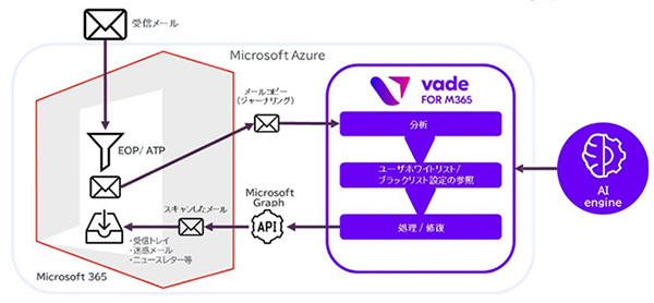 今回取り扱いを開始するVade for M365は、Microsoftが提供するAPIを利用したクラウドベースのサブスクリプション型ソリューション。AIを活用した機能をAPI連携することでMicrosoft 365と一体化した多層防御を実現する。メールサーバー環境にインストールする必要がないため、慣れ親しんだユーザー体験を一切損なわずにメールセキュリティを強化することができる。