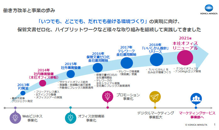 コニカミノルタジャパンは9月21日、空間デザイン事業に関する取組みについてメディア説明会を開催した。説明会では2021年7月にリニューアルした本社オフィスで自社実践した検証結果と、コロナ禍でオフィス改革を支援した事例を紹介。合わせて、オフィス改革支援の新サービスとして「Programming Design Task Flow」を発表した。