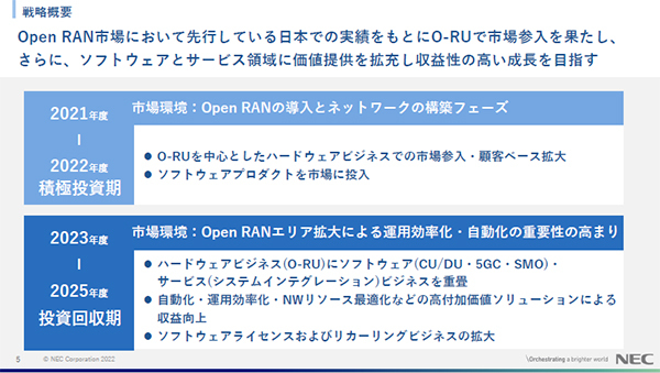 次のフェーズである23年度から25年度は投資回収期としており、O-RUとソフトウェア、SIビジネスを組み合わせ、5Gネットワークを構築するソリューションを統合的に提供するという計画を立てている。ソフトウェアやサービスに軸足を移すことで利益率を伸ばす考えだ。