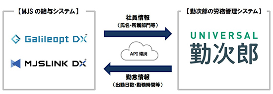 今回のAPI連携により、Galileopt DX 給与大将、MJSLINK DX 給与大将に登録された氏名、所属部門などの社員情報と、Universal 勤次郎に登録された出勤日数、勤務時間、休暇日数などの勤怠情報をワンクリックで自動連携することが可能となった。