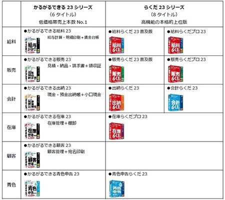 価格は、かるがるできる23シリーズ(全6タイトル)が各4180円。らくだ23シリーズは、「給料らくだプロ23」が2万1780円、「給料らくだ23普及版」が1万4080円、「販売らくだプロ23」が2万1780円、「販売らくだ23普及版」が1万780円、「出納らくだ23」が9900円、「在庫らくだプロ23」が2万1780円、「会計らくだ23」が1万3200円、「青色申告らくだ23」が9900円。
