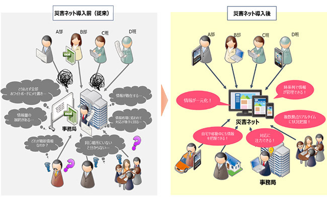 そこで同社では、BCP物流の実現のため、災害時に有効な情報管理手法である「クロノロジー」に着目し、ホワイトボードを活用した災害対応訓練を行っていた。しかし、ホワイトボードでは離れた場所との情報共有が難しく、情報量の物理的な制約もあることからクロノロジーのメリットを十分に活用できていなかった。こうした中、災害時に適切な意思決定と早期対策を図るため、災害ネットを導入した。