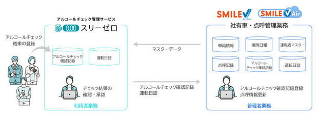 運転者は、さまざまなアルコール検知器に対応したスリーゼロを利用し、モバイル端末で簡単にチェック結果を登録。安全運転管理者は、チェック結果を社有車・点呼管理業務テンプレートにまとめて取り込み、保管できる。同テンプレートは、有効期限などの検知器情報や運転日誌の管理にも対応している。これにより、社有車・運転者情報の一元管理を実現する。