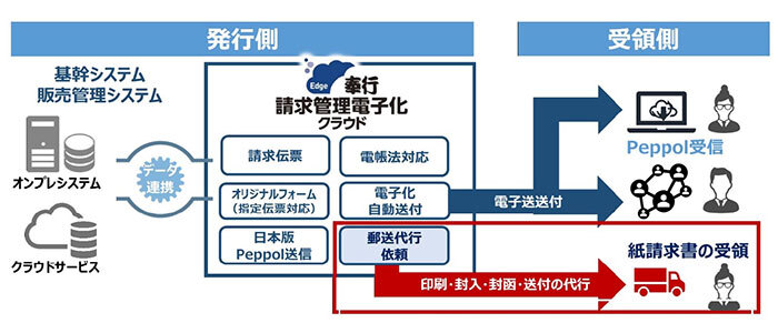 具体的には、「奉行Edge請求管理電子化クラウド」で作成される請求書の電子データの送付先を“郵送代行”に指定するだけで、請求書の印刷から封入・封かん、送付作業をすべて委託でき、社内から請求書の発行作業が完全になくなる。