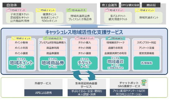 同サービスは、自治体などの運営事業者が従来紙で運営していたポイント、商品券、チケットなどを容易にデジタル化でき、ポイントチャージや加盟店での利用をキャッシュレスで実現するプラットフォームサービス。運営事業者は運営業務の効率化や、住民や観光客などのサービス利用者の購買データ/アンケート結果の分析による地域内消費の活性化や周遊性向上、地域課題の可視化や事業効果の検証など、地域活性化のためのさまざまな施策を行うことが可能となる。