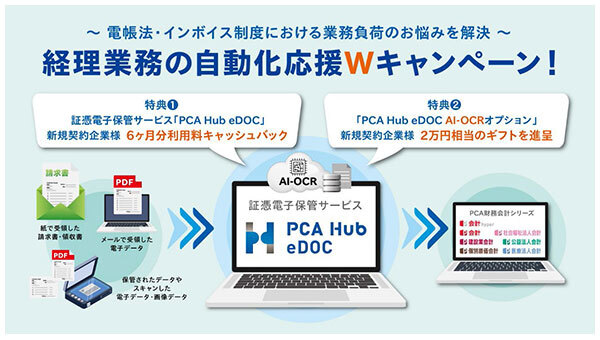 今回のキャンペーンでは、昨年3月にサービスを開始した改正電子帳簿保存法に対応した証憑電子保管サービス「PCA Hub eDOC」を新規に契約した法人に6カ月分の利用料キャッシュバック、また「PCA Hub eDOC AI-OCRオプション」を同時に契約した法人に2万円相当のギフトを進呈する。