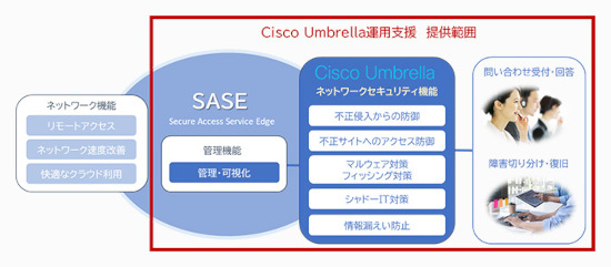 Cisco Umbrella運用支援は、世界最大規模のセキュリティインテリジェンスを保有するシスコシステムズの「Cisco Umbrella」を利用し、テレワーク環境で使用しているパソコンをインターネットの脅威から守るサービス。サイバー攻撃につながる危険なウェブサイトへのアクセスを防止するほか、DNSを使った攻撃の防御、シャドーIT対策、情報漏えい対策の機能も提供する。