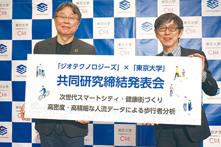 ジオテクノロジーズの杉原博茂社長(左)と東京大学の柴崎亮介教授