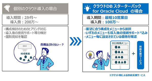 具体的には、Oracle Databaseのクラウドリフト&シフトとOCI導入後の運用サポートについて、ニーズの高い構成パターンとサポート内容をメニュー化することで、導入にかかる費用と期間を抑えたサービス提供を実現。メニューごとに価格が設定されているため、メニューを選択した時点で導入費用を確認できる。メニューの中から要望に合うシステム構成を選択するだけで、最短10営業日でOracle Databaseのクラウドリフト&シフトが可能となる。