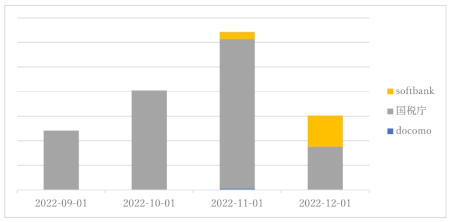 日単位で動きをとらえてみると、ソフトバンクを騙るフィッシングサイトが検出されている期間が、国税庁を騙るフィッシングサイト数が落ち着いている期間と一致し、フィッシングの成果を検証しているかのような動きが見られることから、国税庁をターゲットとした攻撃者が、攻撃対象をソフトバンクに切り替えた可能性が考えられる。