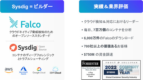 また、クラウドでの脅威の検知と対応のためのオープンソース標準であるFalcoの生みの親として、クラウドのワークロード、ユーザー活動、クラウド活動を監視することで、セキュリティチームがサイバーセキュリティ攻撃から防御できることを支援している。Sysdigのランタイム脅威検知は、最大のリスクを生む脆弱性、設定ミス、コンプライアンスギャップに焦点を当てることで、企業のセキュリティ体制を改善するのに役立つ。
