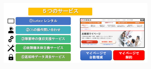 導入企業は、初回の申し込み契約後は、専用ポータルサイト「お客様マイページ」でSurfaceの台数増減や解約手続きを完結させることが可能。契約は、1台から契約期間に縛られず台数増減ができる。同サービスで提供するSurfaceは複数のモデルを用意し、数量を自由に組み合わせて契約することが可能。また、Surface本体のレンタルだけではなく、同社コンタクトセンターでのOSの操作問い合わせや、エンジニアの訪問による復旧支援・交換対応など、大塚商会ならではの保守サービスを標準で提供する。