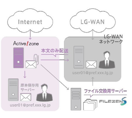 具体的には、Active!zoneの添付ファイル分離詳細画面でファイルを確認し、必要なファイルは「ファイルサーバーに保存」をクリックすると、FileZen SのアカウントIDの入力を求められる画面に遷移する。アカウントIDを入力すると、自動的に該当フォルダーにファイルがアップロードされる。また、自治体の多くで利用されている共有アドレスやメーリングリスト宛のメールに添付されているファイルもFileZen Sの個人ボックスに取り込むことができる。