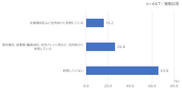 それによると、Microsoft 365を利用している法人のチャットボット導入状況は「社内利用」が26.4%、「社外利用」が16.2%と、社内向けでの利用が進んでいることがわかった。その利用方法は、Microsoft 365などの「社内で導入済みサービスのナレッジ共有」が51.7%で最多だった。