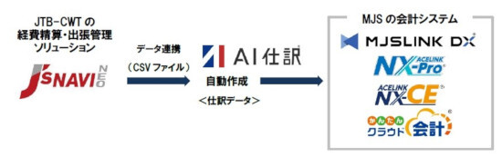 今回のデータ連携によって、J'sNAVI NEOから出力した交通費や交際費、出張精算などに関するCSVファイルをMJSの会計システムに取り込むことで、AI仕訳による過去の仕訳データとの照合により、会計上の仕訳の自動生成が可能となる。これにより、会計・経理部門などに従事するユーザーは、会計システムにデータを転記する作業や勘定科目を選択する手間がなくなり、会計業務の効率化を実現する。