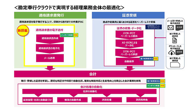 リニューアルした勘定奉行クラウドでは、インボイス制度・電帳法で求められる適格請求書の発行・受領・証憑の電子保存などを含む幅広い経理業務に対応する。会計システムとしての高い品質は従来通り維持しながら、AIをはじめとした最新技術を積極的に取り入れることで、改正対応によって業務負担を増やすことなく、生産性の高い業務を実現する。