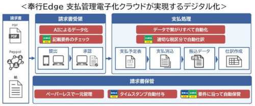 奉行Edge 支払管理電子化クラウドは、電子データで受領した請求書だけでなく、紙で受領した場合もデータ化してそのまま支払処理への活用が可能となり、請求書の受領から支払いまでの業務プロセスを確実にデジタル化できる。請求書の受領形式を問わず、請求書の受領から支払いまでの一連の支払業務をデジタル化することで、インボイス制度・電帳法時代の支払業務に求められる標準的な業務運用を実現する。