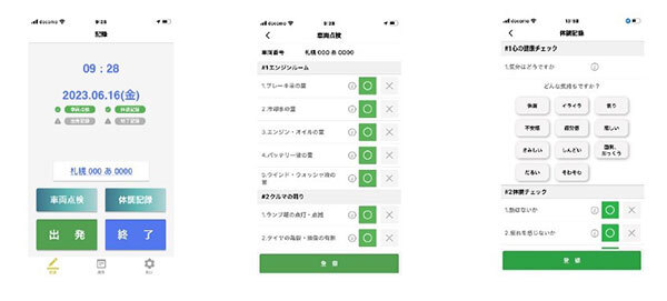 これにより、スマートフォンから車両点検・体調の記録と閲覧が可能となる。管理者は、ユーザーが登録した記録を管理画面から一元管理できる。車両点検記録機能では、標準の運転前点検項目に加え、任意の項目を設定することができる。体調記録機能では、体の健康に加え、心の健康のチェックも可能(任意項目の設定も可能)となっている。