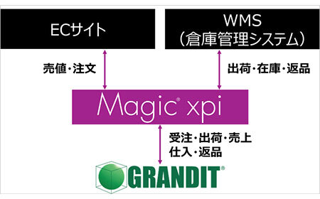 Magic xpiの採用によってシステム間連携が可能となり、より効率的な発注業務が期待でき、GRANDITを使用する際は、自社で開発した販売管理システムや在庫管理(WMS)を接続することで、会計業務の負荷・工数削減を実現。また、システム間連携によってリアルタイムなデータ更新を可能とした。