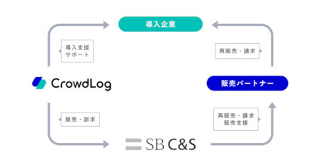 ディストリビューター契約は、販売代理店がメーカーから商品を買い取り、販売パートナーを通じて顧客に対して販売する方式での契約を指す。今回、クラウドワークスの自社開発プロダクトであるクラウドログをSB C&Sが買い取り、販売パートナーを通じて導入企業へと販売を行う。また、導入支援のサポートについては、クラウドログが導入企業に対して直接行うというスキームでの取り組みを開始する。
