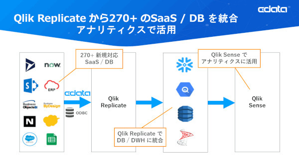 Qlik Replicate内でCData ODBC Driverを使用することにより、kintone、Microsoft Dynamics 365、Microsoft SharePoint、ServiceNow、Oracle NetSuiteなどの270以上のSaaS・DBデータをデータ分析基盤DB/DWHに統合できる。ERP・CRMなどエンタープライズ業務データに社内の誰もがアクセスし、分析・活用できる環境構築を支援する。