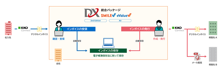売り手はデジタルインボイスを発行、買い手はデジタルインボイスを受領するための準備が必要となるが、買い手の準備が整うまで時間がかかることが想定される。そのため当面は、買い手ごとにインボイスの発行方法(デジタルインボイス、PDF文書など)が混在し、買い手ごとに切り分ける業務負担が発生する。今回機能強化したDX統合パッケージと「KMD Connect」を利用することで、発行方法を意識せず買い手にあわせてインボイスを発行できる機能も提供する。