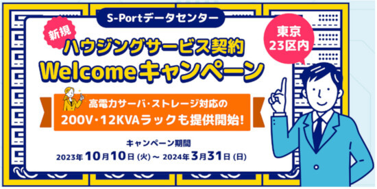 また、先着限定3ラックで、S-Port東京第一センター標準ラックと、200V実効12KVA電源(3KVA×4本)のハウジングサービスの初期費用が無料となる。