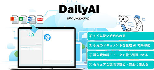 DailyAIは、Azure OpenAI Serviceを用いて開発した生成AIサービスで、入力情報を学習に利用せず、顧客のデータを保護するために、強固なセキュリティ対策を施している。DailyAI側で用意するMicrosoft Entra ID(旧Azure AD)を用いたユーザー認証とアクセス元のIP制限をかけることができるため、セキュアに利用できるのはもとより、顧客側での導入時の設定作業もなく、素早く簡単に始めることが可能。さらに、管理者専用ポータルサイトから日々の利用状況をグラフで確認したり、ユーザーID、日時、対話内容などの利用データ(ログ)をダウンロードすることで、分析や監査などに用いることができる。