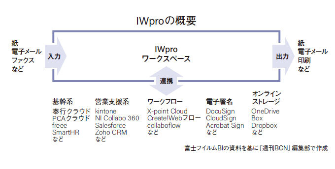 IWproは基幹系や営業支援系、ワークフロー、電子署名、オンラインストレージなど中堅・中小企業がよく使っている業務アプリを連携させ仕事を進められるワークスペース。発売時には15種類のアプリと連携し、段階的に30種類余りに増やしていく予定だ。業務アプリに閉じて行っていた作業をIWproのワークスペースから見えるようにするとともに、外部から紙や電子メール、ファクスなどで入ってきた文書をワークスペースで整理して業務アプリに受け渡す用途などを想定している(図参照)。