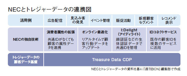 NECとトレジャーデータは昨年末に業務提携を行い、トレジャーデータの顧客データ基盤「Treasure Data CDP」上で、NECのデジタルマーケティング関連のツール群を使えるようにした(図版参照)。CDPは店舗やオンラインから収集した顧客データ管理するほか、既存の顧客管理や営業支援などのシステムとデータのやりとりを行うもので、この基盤上にNECのツール群を構築。顧客データに基づく見込み客の発掘や販促活動などを行えるようにしている。