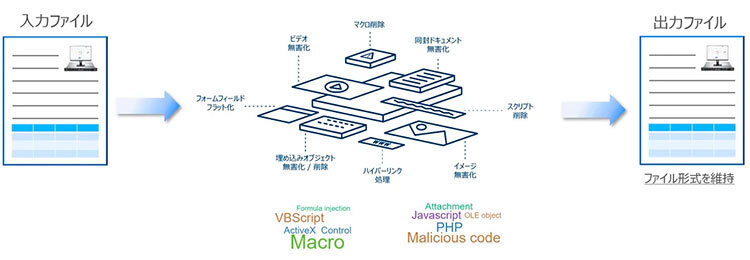 すべてのファイルに悪意があるものとみなし、ファイル内の潜在的に悪意のあるコンテンツを削除・無効化することで非武装化するDeep CDR(無害化)を提供する。多くのファイルが1秒以内から数秒で無害化できる高速性と、ファイルが崩れずファイル形式もそのままで、処理前、処理後のファイルイメージが変わらないユーザビリティを維持したまま安全なコンテンツに再構築できる安定性が、多くの顧客に評価されている。