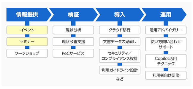 「Copilot セキュリティ強化サービス」(セキュリティ/コンプライアンス設計)は、Copilot利用に際し、顧客のMicrosoft 365テナントで実装すべきセキュリティ機能の設計・環境設定を実施する。